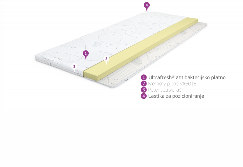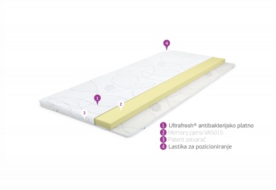 Memory pjena unutar navlake Nadmadraca Memory je visine 4 cm. Memory pjene drže Vaše tijelo u pravilnom položaju oslobađajući ga od pritiska i rezultirajući poboljšanju cirkulacije. Kada ležimo na podlozi od memory pjene, zrak se pomiče kroz susjedne ćelije toliko koliko je potrebno da pjena poprimi obrise kontura tijela i prilagodi mu se na njemu jedinstven način, istovremeno mu osiguravajući potrebnu potporu bez nepotrebnog pritiska. Memory pjene su postale posebno popularne u posljednjih nekoliko godina, zbog karakteristike da se prilagođavaju Vašem jedinstvenom tijelu. Memory pruža zadivljujući osjećaj bez suvišnog pritiska, dokazano poboljšava cirkulaciju krvi tokom sna, osigurava senzacionalan osjećaj bestežinskog stanja, te osigurava spokojan san bez nepotrebnog buđenja i suvišnog okretanja. Izravna i najočitija posljedica prevelikog pritiska je prekomjerno okretanje u snu. Okrećemo se i pokušavamo naći što bolji položaj tijela. Ležeći na memory podlozi nema povratnih sila jer u ćelijama nema zadržanog zraka koji bi vršio pritisak i uzrokovao neudobnosti. Izravna posljedica korištenja memory pjene je smanjenje okretanja za čak 80 % što rezultira opuštajućim snom.