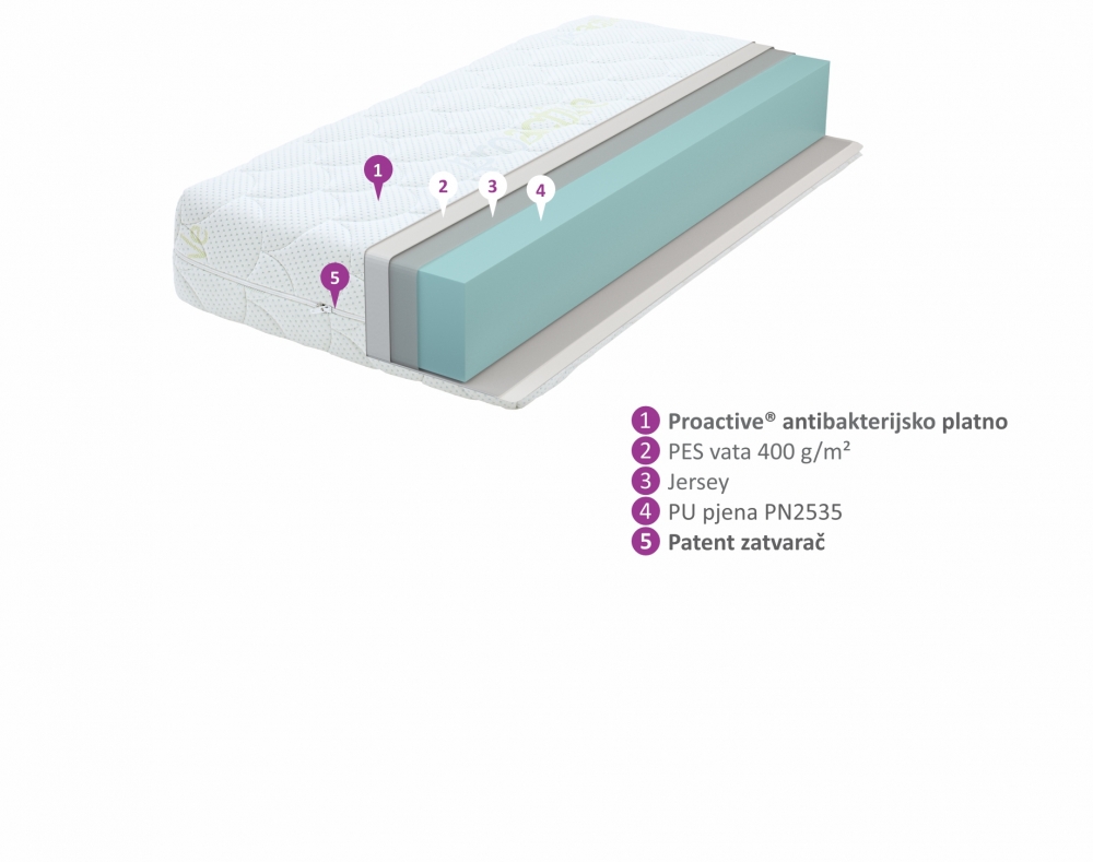 Proactiv® platno je posljednja riječ tehnologije za borbu protiv neželjenih efeketa štetnih mikroorganizama, gdje smo u kombinaciji sa specijalno dizajniranim jezgrom dobili madrac koji predstavlja okruženje za zdrav i miran san. Recite zbogom grinjama sa madracem Basic Baby Patent.