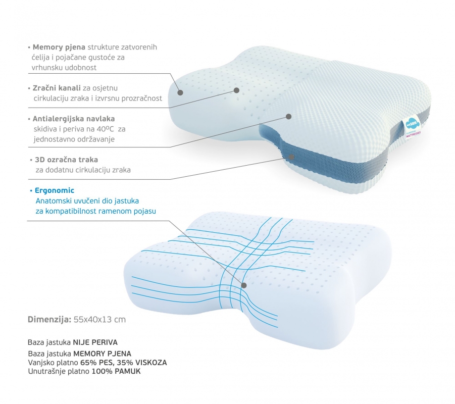 - Izrađeni od visokokvalitetne memory pjene, anatomski oblikovane za stavljanje glave u odgovarajući položaj za spavanje kako bi se izbjegli negativni efekti okretanja i traženja idealne pozicije tokom spavanja.