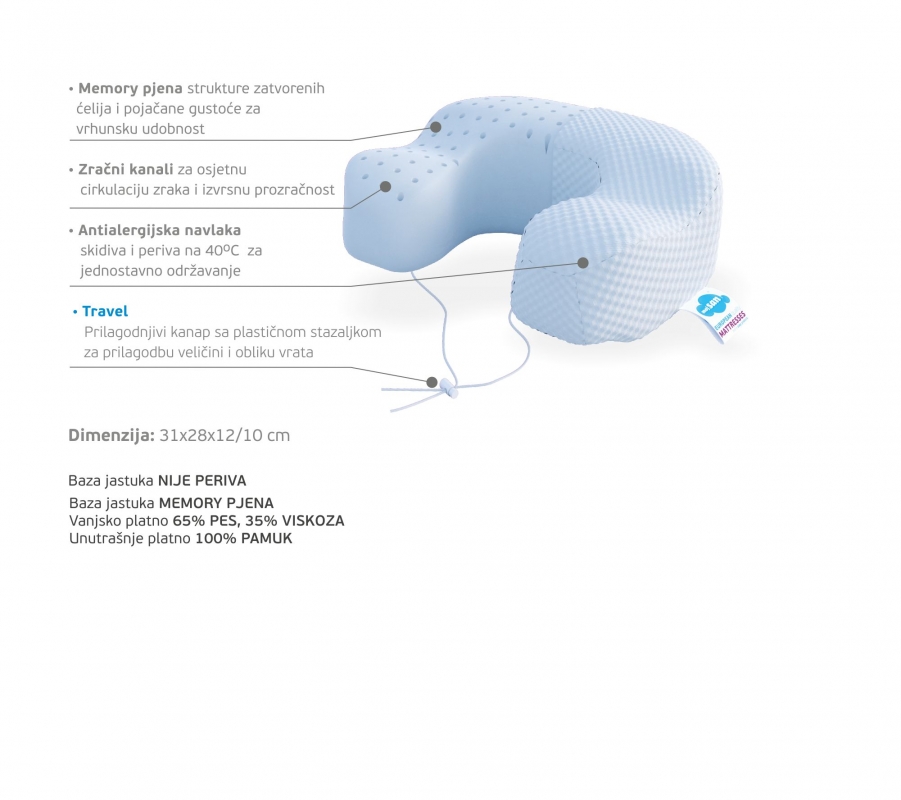 Izrađen je od visokokvalitetne memory pjene, posebno, anatomski oblikovane za stavljanje glave u odgovarajući položaj za spavanje na nepredvidim mjestima kako bi se omogućilo spavanje u uslovima koji ne priliče klasičnom ambijentu spavanja u krevetu. Memory pjena je radi dodatne udobnosti perforirana te jastuk ima mogućnost disanja kroz zračne kanale.