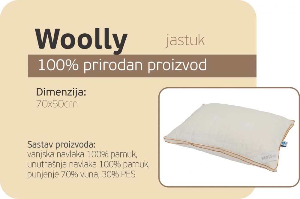Vuna je prirodan, biorazgradljiv i obnovljiv materijal koji ne samo da pruža termoregulirajuću izolaciju u toplim ili hladnim uslovima nego također i regulira vlažnost zraka stvarajući savršene uslove za spavača. Vuna korištena za punjenja proizvoda iz MojSan Woolly kolekcije je certificirana od strane WOOLMARK company kao globalnog autoriteta na polju kreiranja proizvoda sa vunom za korištenje u sistemima za spavanje.