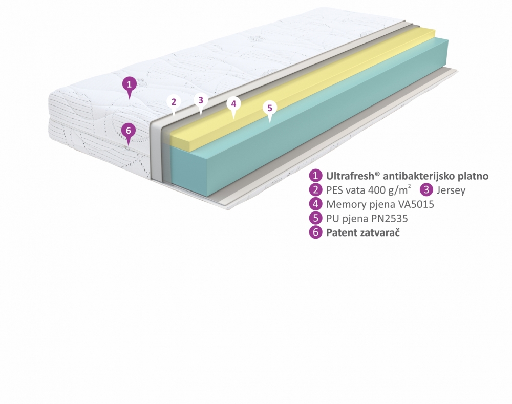 - Termoaktivna memory pjena prilagođava se individualnoj konturi tijela te osigurava izuzetnu udobnost i opuštenost