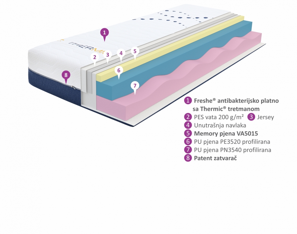 Kombinacija PU pjena kao idealna potpora uz memorijsku pjenu ima zadatak da tijelo spavača pozicionira u pravilan anatomski položaj pružajući idealan komfor za spavanje.