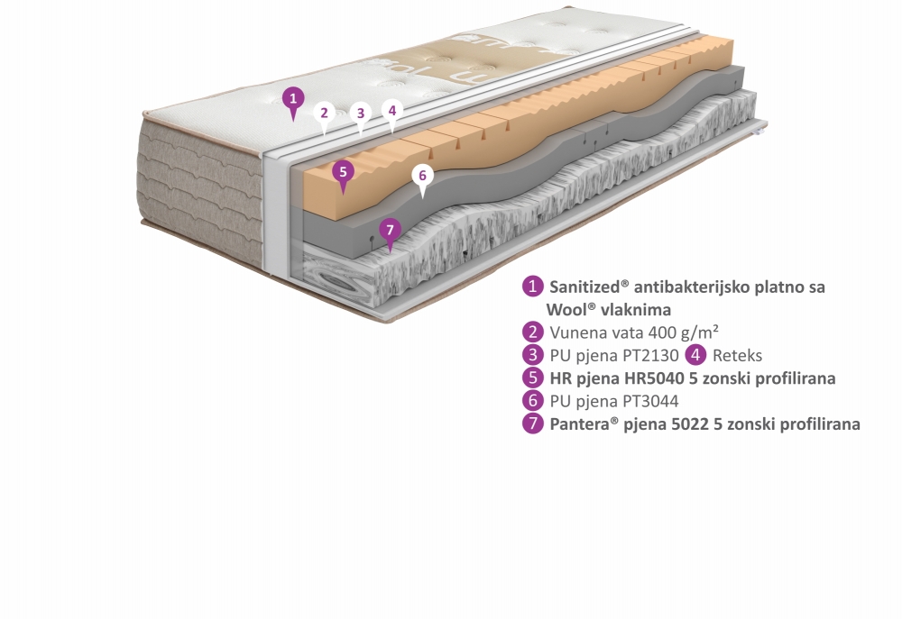 Madrac Woolly je premium madrac visokih performansi za spavače koji iznad svega preferiraju prirodne materijale i vrhunsku udobnost. Jezgra madraca na bazi kombinacije HR pjena visoke gustoće i kvalitete raspoređuje pritisak tijela u skladu sa svojom 5 zonskom profilacijom uz dodatnu upotrebnu vrijednost opcije korištenja obje strane modela.