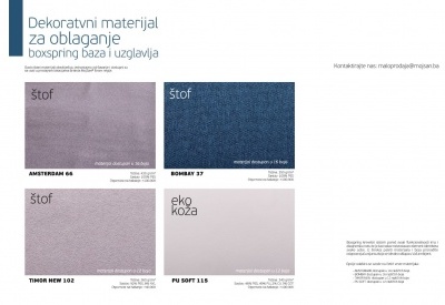 Odabir vrste materijala i 56 različitih boja prema kojima možete stilizirati Vaše BoxSpring krevetne sisteme MojSan je omogućen kroz štof opcije Amsterdam, Bombay i Timor New te opcije eko kože PU SOFT.