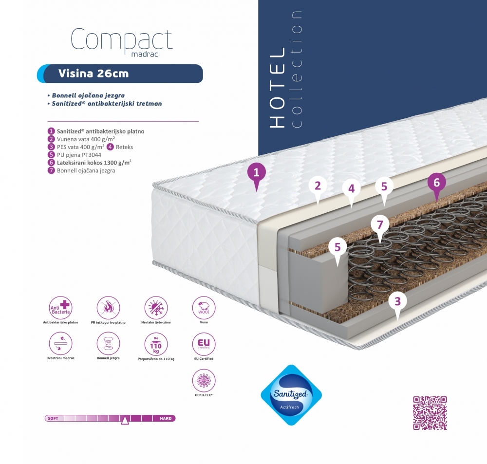 Madrac Compact je osnova ponude madraca MojSan® na bazi ojačanih bonnell opruga koje zajedno sa pjenom pojačane tvrdoće garantiraju kompaktnu podlogu spavanja. Kokos, prirodan materijal ugrađen u strukturu madraca, na prirodan način upotpunjuje osjećaj potpore kakvu Vaše tijelo treba. Čvrsto definirana struktura madraca sa jakim bočnim ojačanjima je njegovu upotrebnu vrijednost, pored kućne, usmjerila ka primjeni u hotelskim sobama. Antibakterijska zaštita u vidu Sanitized® tretmana aplicirana na platno uz bogato punjenu ljetnu i zimsku stranu navlake madraca, pruža praktičnost cjelogodišnje upotrebe. Madrac Compact, dašak prirode u Vašoj sobi!